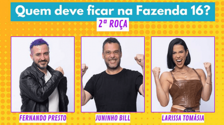Sobreviver na Fazenda não é para qualquer um. Mais uma berlinda está devidamente formada e apenas dois participantes permanecem no jogo. Vote na Enquete A Fazenda 16 e salve seu peão favorito na 2ª Roça: quem você quer que fique, Fernando Presto, Juninho Bill ou Larissa Tomásia?