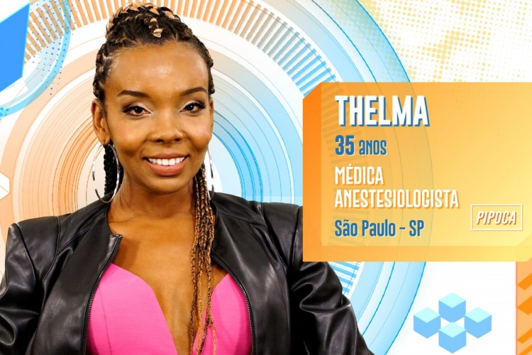 Médica anestesiologista, 35 anos e natural de São Paulo. A participante Thelma é bailarina e se formou em medicina com bastante garra e suor. Quando não está dando plantão em um dos quatro hospitais onde trabalha, a sister está sambando na quadra da Mocidade Alegre. Ela faz parte do grupo Pipoca no BBB20.