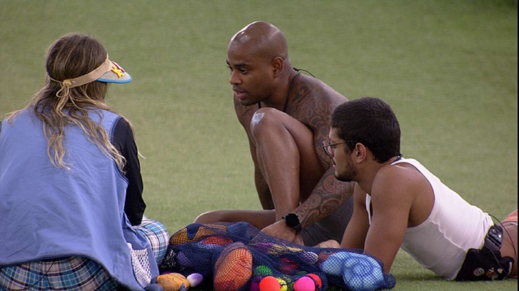 Cezar conversa com Larissa e outros brothers no gramado da casa do BBB