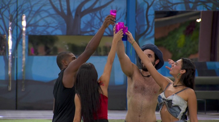 No jardim, Alane, Davi, Isabelle e Matteus curtem o cooler que receberam para comemorar por estarem na reta final do programa.