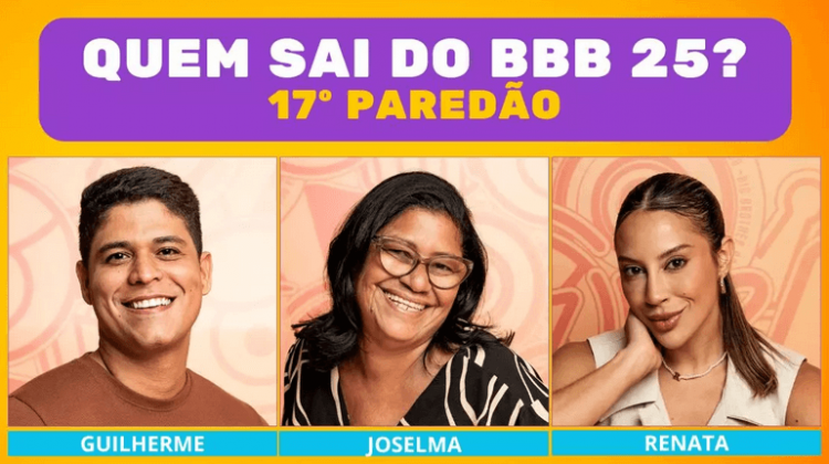 A enquete BBB 25 está no ar e você já pode mostrar a sua opinião no 17º Paredão. Em plena reta final, quem deve deixar a casa mais vigiada do Brasil? Após uma votação relâmpago, Guilherme Vilar, Joselma Silva e Renata Saldanha correm risco de eliminação na terça, 15/04.