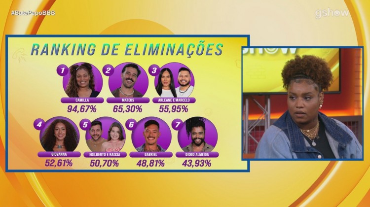Depois de deixar o BBB 25, Camilla vê a porcentagem de votos que a eliminou durante o Bate-Papo BBB. A trancista se surpreende ao descobrir que saiu com 94,67% dos votos. A ex-sister opina sobre seus atos dentro do reality.