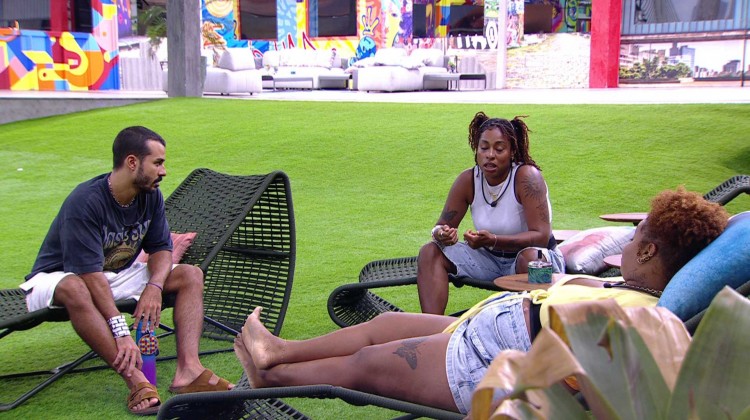 A Líder Eva monta o seu Na Mira do Líder com Vitória Strada, Gracyane Barbosa, Mateus, Camilla e Thamiris. Logo após receberem as pulseiras de alvo no Paredão, os três últimos conversam no jardim do BBB 25, na madrugada deste sábado (15).