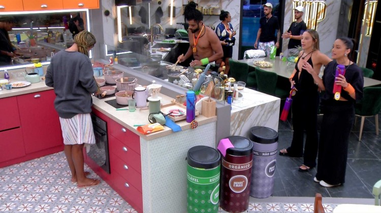 Na cozinha do 25, Giovanna comenta com Renata e Eva o que ouviu as sisters falando durante o almoço especial desta quarta-feira (29). Na ocasião, as sisters comentaram de atitudes de outros participantes, sem saber que o restante da casa estava ouvindo.