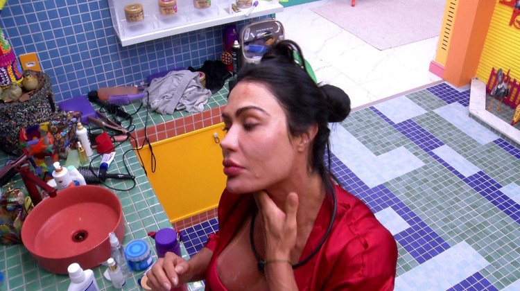 Gracyanne Barbosa foi escolhida durante o almoço pós-Big Fone para ficar de fora do Show de Quarta, com Rodriguinho, Gaab e Mr. Dan. Sozinha na casa mais vigiada do Brasil, a musa fitness aproveita para hidratar a sua pele.
