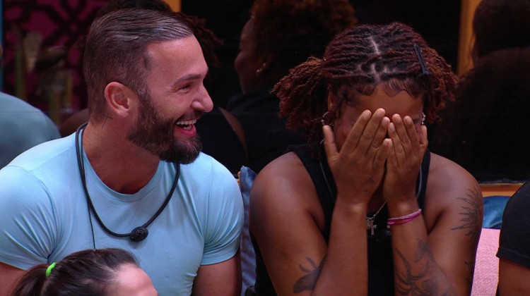 Os brothers aplaudem e o ginasta e a nutricionista comemoram.