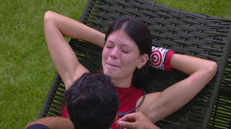 Após conversar com Diogo Almeida, o Líder da Semana, sobre o a formação de Paredão deste domingo (26), Vitória Strada deita na área externa da casa. A atriz começa a chorar e Mateus, sua dupla no jogo, a consola.